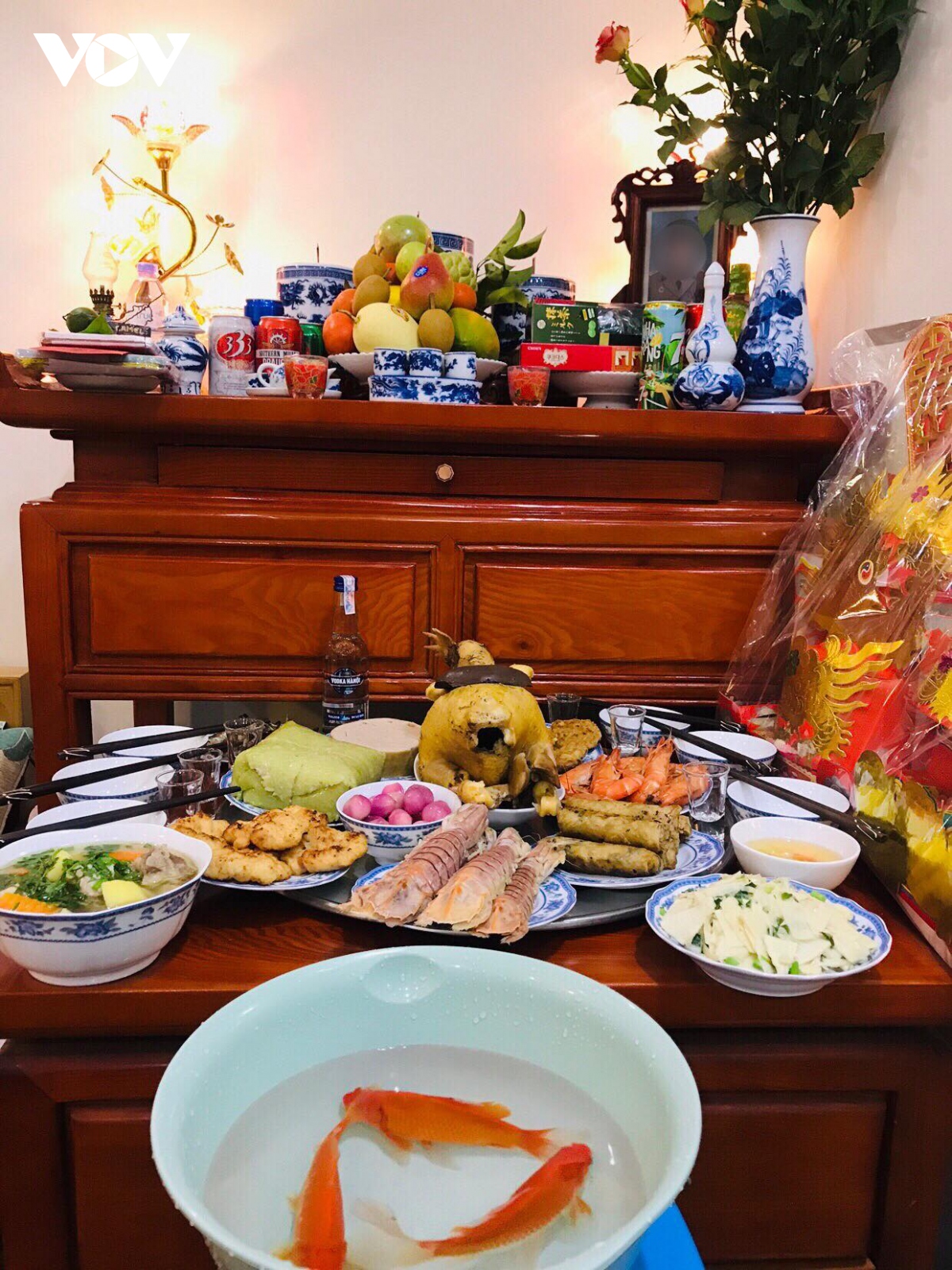 タオ 毎年の旧暦12月23日正午までに、殆どの家庭はかまどの神様に、伝統的なお供えの行事を行います。かまどの神様は、家庭内の事情を良く知っているので、家の1年の善悪を報告するためこの日に鯉に乗って天に昇ると信じられているのです。