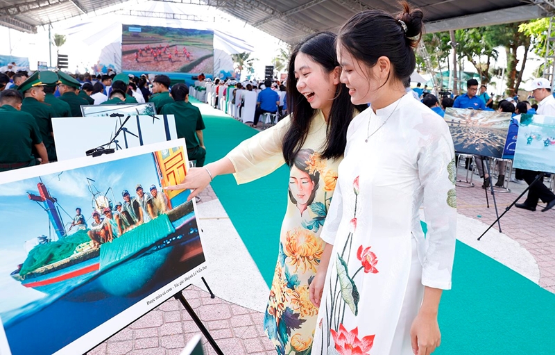 យុវជនទីក្រុង Nha Trang ទស្សនាការតាំងពិព័រណ៍រូបថតក្នុងពិធីបំផុសសប្តាហ៍កោះសមុទ្រវៀតណាម។ រូបថត៖ Khuong Trung /dangcongsan.vn |