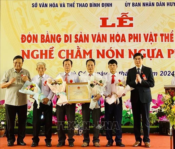 ពិធីប្រគល់សញ្ញាបត្រ បេតិកភណ្ឌវប្បធម៌អរូបីជាតិសម្រាប់ “សិប្បកម្មធ្វើមួកសេះ Phu Gia” ដល់គណៈកម្មាធិការបក្ស និងអាជ្ញាធរស្រុក Phu Cat។ រូបថត៖ TTXVN |
