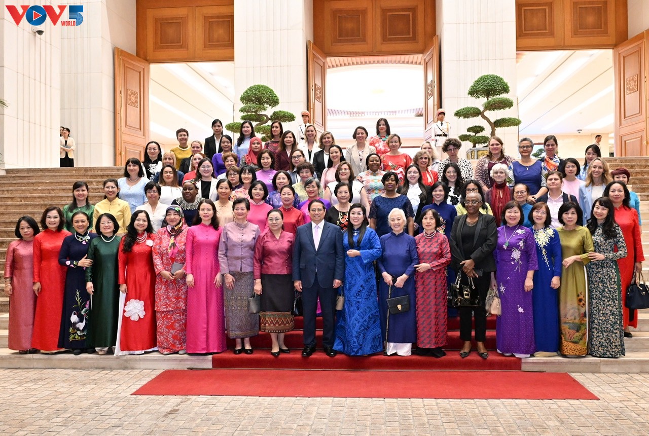 នាយករដ្ឋមន្ត្រីបានថតរូបជាមួយមន្ត្រីការទូតស្ត្រីវៀតណាម និងអន្តរជាតិ។ រូបថត៖ VOV |