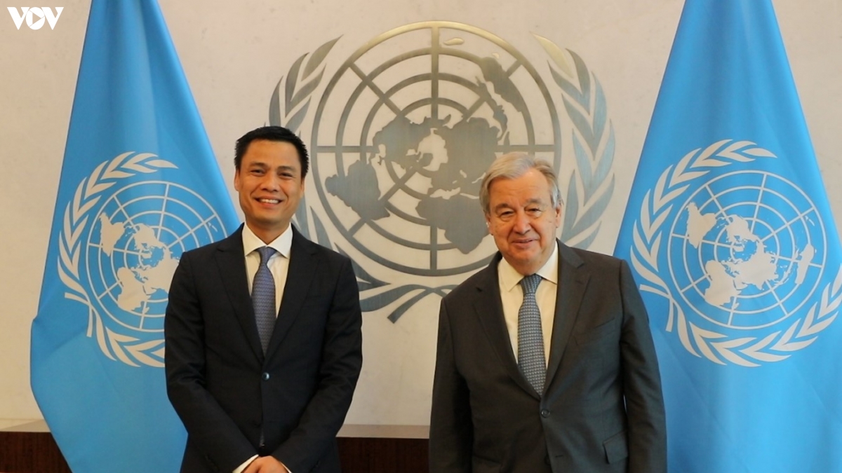 នាថ្ងៃទី ១២ កក្កដា ឯកអគ្គរដ្ឋទូត លោក Dang Hoang Giang ប្រធានបេសកកម្មអចិន្ត្រៃយ៍វៀតណាមប្រចាំនៅអង្គការសហប្រជាជាតិអញ្ជើញជួបសន្ទនាជាមួយអគ្គលេខាធិការអង្គការសហប្រជាជាតិលោក Antonio Guterres (រូបថត៖ VOV)