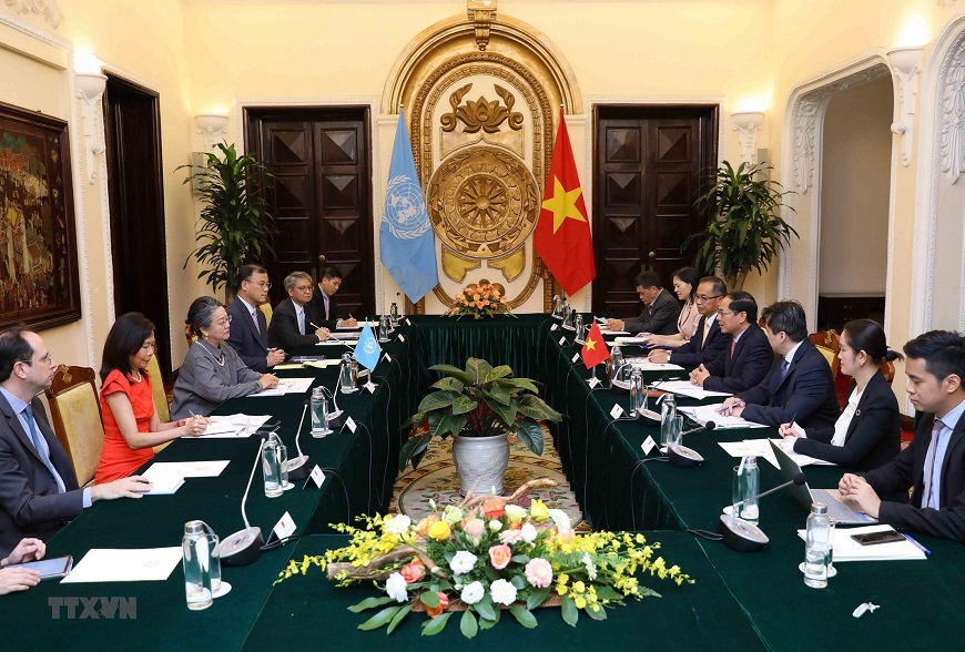កិច្ចសន្ទនារវាងរដ្ឋមនត្រីការបរទេសលោក Bui Thanh Son ជាមួយអគ្គលេខាធិការរងអង្គការសហប្រជាជាតិ និងជាលេខាធិការប្រតិបត្តិ ESCAP លោកស្រី Armida Salsiah Alisjahbana ។ An Đăng/TTXVN |