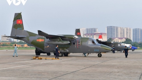 (VOVWORLD) - ជួរយន្តហោះដឹកជញ្ជូនរបស់កងពលតូចទ័ពជើងអាកាសលេខ ៩១៨ (ផ្នែកទ័ព ការពារដែនអាកាស - ទ័ពជើងអាកាស) ហាត់សមនៅអាកាសយានដ្ឋាន Gia Lam ទីក្រុងហាណូយ ដើម្បីត្រៀមបំពេញភារកិច្ចនៅពិធីរំលឹកខួប ៨០ ឆ្នាំនៃបដិវត្តន៍ ខែសីហា និងទិវាបុណ្យជាតិថ្ងៃទី ២ កញ្ញា។