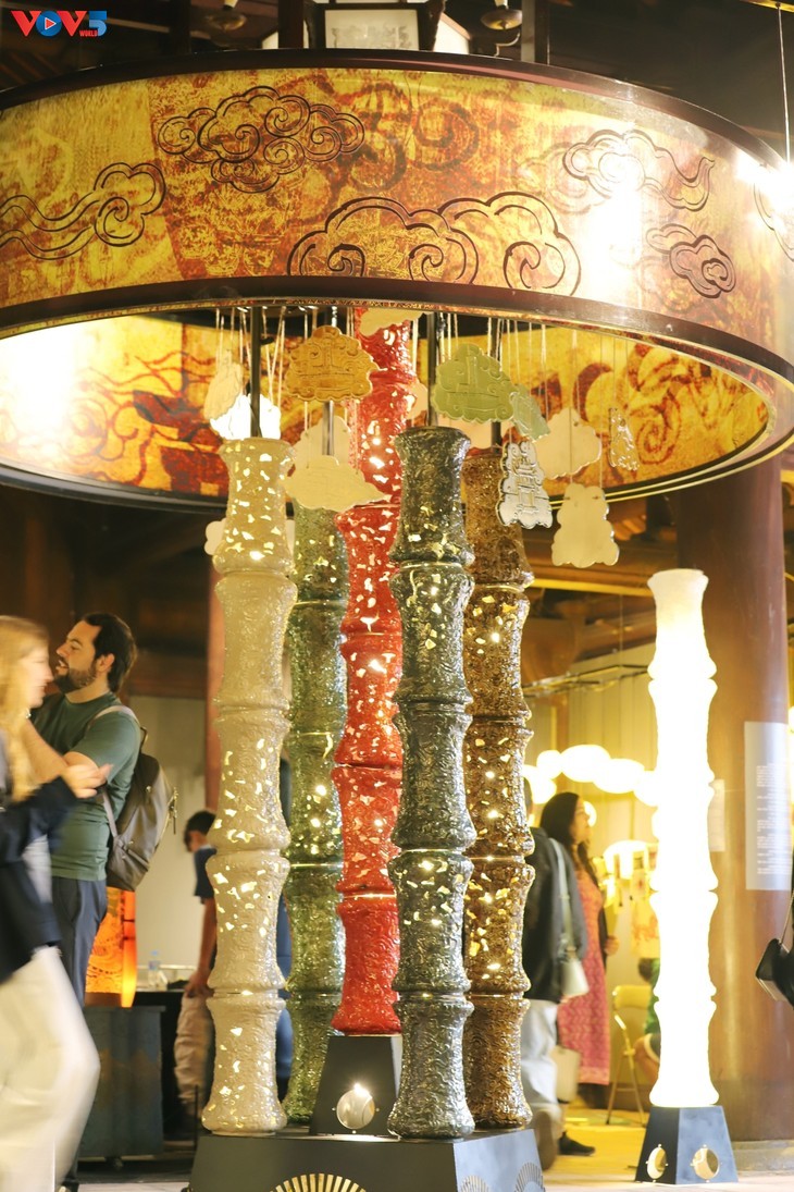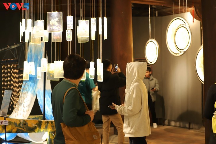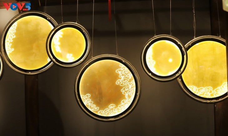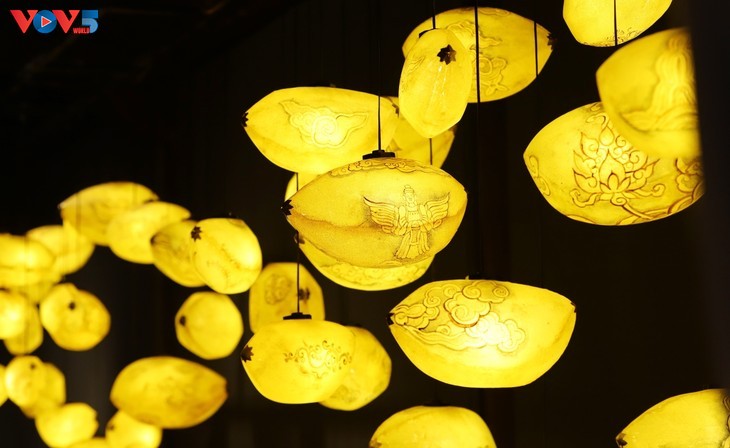 ស្នាដៃ "ចម្លាក់" របស់វិចិត្រករ Vu Xuan Dong រួមមានចង្កៀងរូបគ្រាប់ស្រូវអង្ករជាមួយនឹងក្បូរក្បាច់ត្រូវបានគូរដោយដៃ ចាប់ពីសម័យវប្បធម៌ដុងសឺន ដល់រាជកាលស្តេច Dinh, Ly, Tran, Le, Nguyen ដែលរំឮកដល់របរឆ្លាក់ពីសំរិទ្ធ និងប្រាក់ដ៏ល្បីល្បាញ។