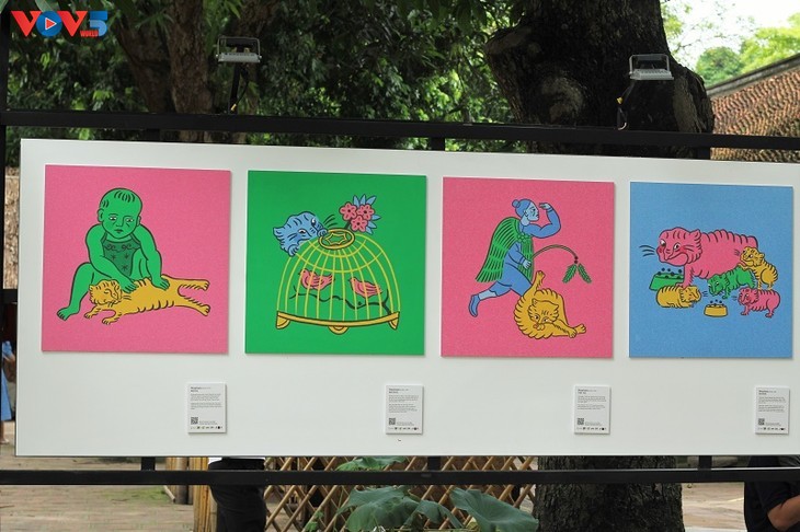 នាពេលថ្មីៗនេះ ការតាំងពិព័រណ៌គំនូរដោយប្រធានបទ “ប្រជាប្រិយភាពក្នុង Gen Z” បានបើកនៅ Van Mieu - Quoc Tu Giam ដោយនាំមកនូវទស្សនៈថ្មីថ្មោង ពោពេញទៅដោយភាពច្នៃប្រឌិតអំពីវប្បធម៌ប្រជាប្រិយវៀតណាម។ រូបភាព៖ មន្ទីរវប្បធម៌ និងកីឡាទីក្រុងហាណូយ