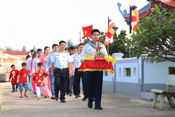 | យុទ្ធជននិងប្រជាជននៅលើកោះ Da Tay A ទៅវត្តដើមឆ្នាំ បួងសួងសុំសន្តិភាពដល់មាតុភូមិ សេចក្ដីសុខដល់ប្រជាជន ហើយសន្យាបំពេញភារកិច្ចការពារអធិបតេយ្យភាពកោះសមុទ្រមាតុភូមិដ៏ពិសិដ្ឋ នៅលើប្រជុំកោះ Truong Sa។ រូបថត៖ Le Hoang/VOV |