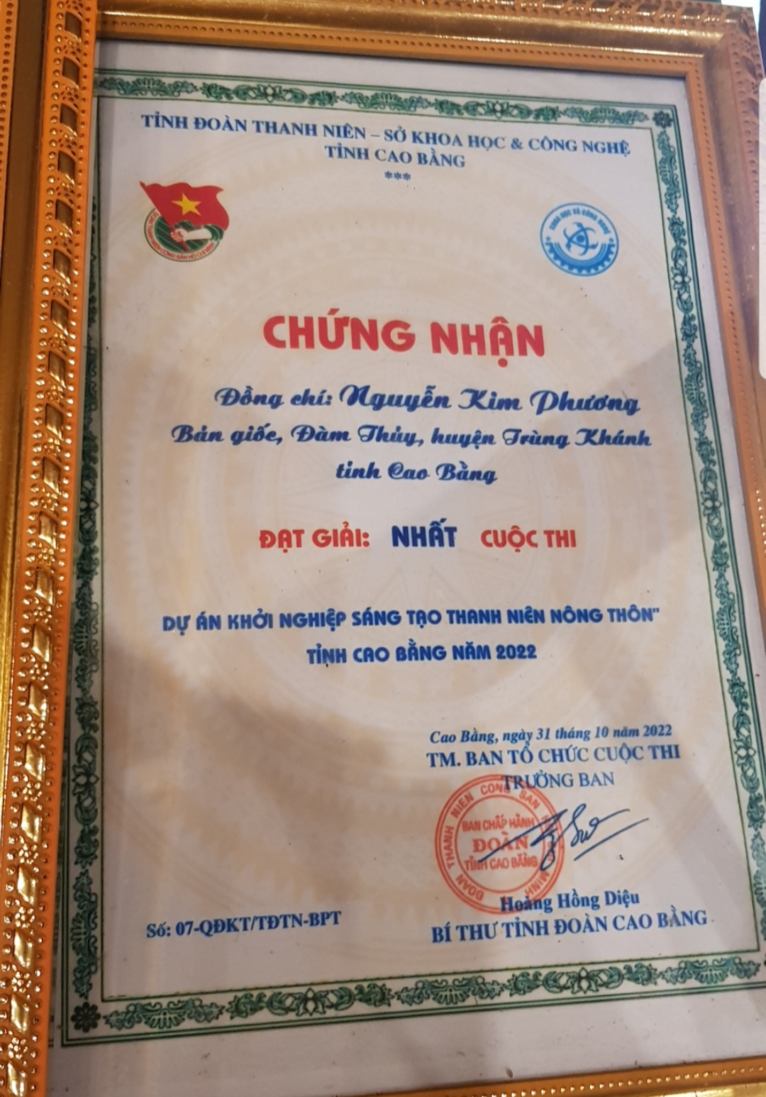 វិញ្ញាបនបត្ររង្វាន់លេខមួយក្នុងការប្រកួតប្រជែងគម្រោងចាប់ផ្តើមច្នៃប្រឌិតយុវជនជនបទឆ្នាំ ២០២២ នៅខេត្ត កាវបាំង (រូបថត៖ ង៉ុក អាញ់) |