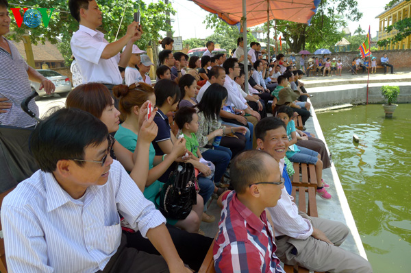 ភ្ញៀវទេសចរណ៍សាកល្បងបញ្ជាតុក្តាក្នុងបណ្ឌលកាំងពិព័ណ៍របាំតុក្តាទឹក នៅឃុំ Hong Phong។