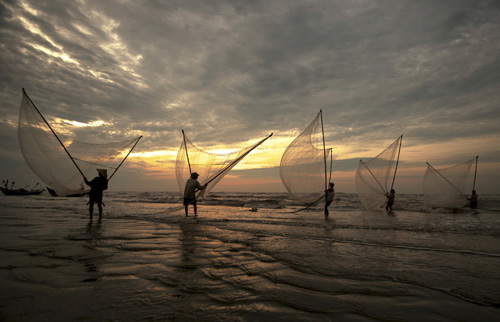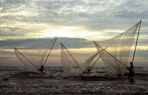 គយគន់ទិដ្ឋភាពដ៏ល្វឹងល្វើយនិងប្រជាជនរៀបចំសំណាញ់ និងចេញទូកទៅនេ