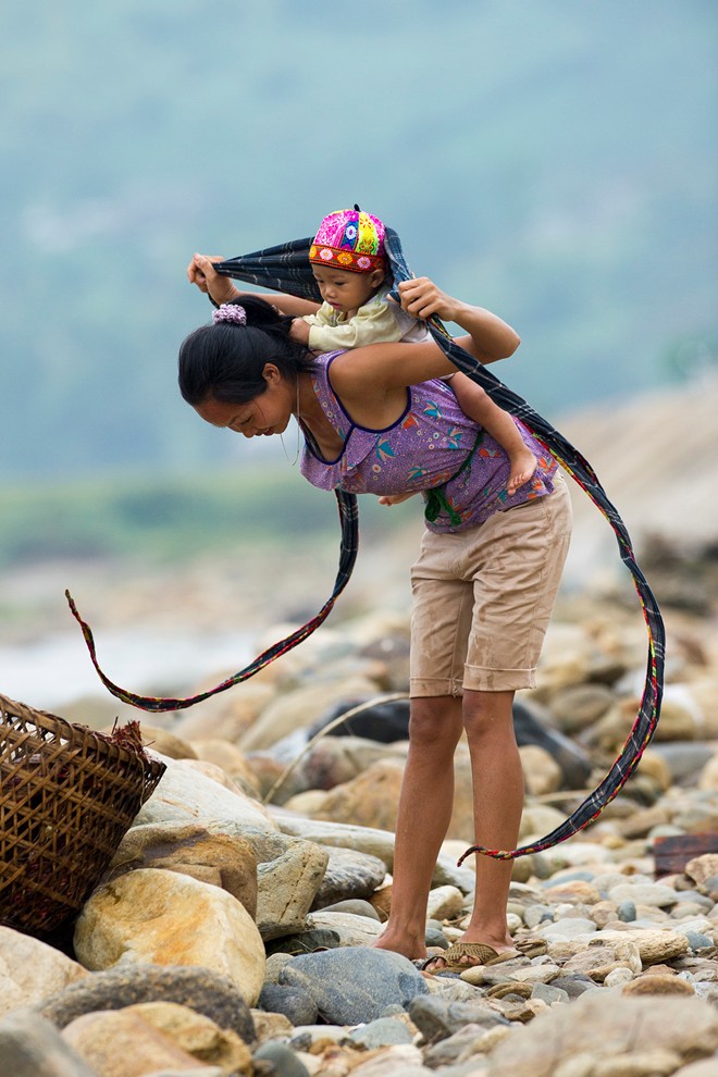 ម្តាយស្ពាយកូនទៅធ្វើការ។