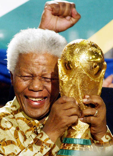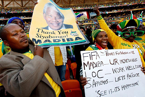 | ក្នុងពិធីបើក World Cup 2010 បណ្ដាកីឡាការកីឡាការនីបានស្រែកបន្លឺកងរំពង និងលើកផ្ទាំងបដាដែលមានរូបថតរបស់លោក Mandela សំដៅថ្លែងអំណរគុណចំពោះ លោក Mandela ។ (រូបថត៖ Icon SMI) |