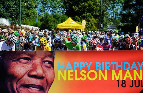| នេះគឺជាផ្ទាំងប៉ាណូរអបអរសារទទិវាកំណើតលើកទី ៩៤ របស់លោក Mandela ក្នុងការប្រគួតកីឡាជិះកង់ Tour de France 2012 (រូបថត៖ Getty)។ |