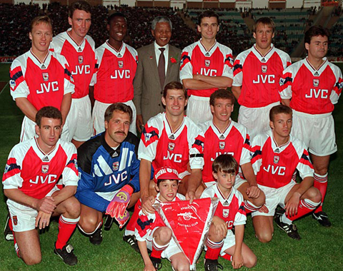 | លោក Nelson Mandela ថតរូតជាអនុស្សាវរីយ៍ជាមួយក្រុមកីឡាបាល់ទាត់ Arsenal នៅទីក្រុង Johannesburg នាឆ្នាំ ១៩៩៣ ។ (រូបថត៖ Getty) |