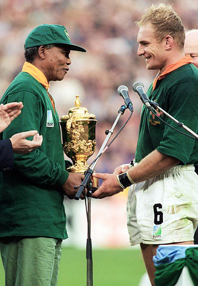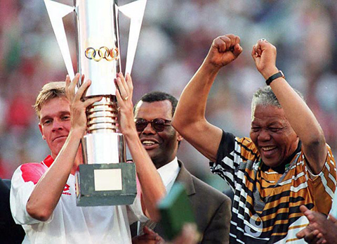 | លោក Mandela ប្រគល់គុបពានសំរាប់ប្រធានក្រុមកីឡារករបាល់អោប របស់អាហ្វ្រិកខាងត្បូង លោក William Webb ក្នុងឱកាសក្រុមកីឡារបាល់អោប នៃប្រទេសនេះបានឈ្នេះ ក្រុមកីឡារករ បាល់អោប ក្នុងវគ្គផ្តាច់ព្រ័ត្រ បាល់អោប ពិភពលោកឆ្នាំ ១៩៩៤។ (រូបថត៖ Getty) |