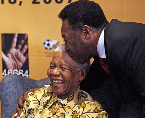 | “ស្តេចកីឡាបាល់ទាត់” Pele ស្វាគមលោក Mandela មុនពេលពិធីរំលឹក ខួបអនុស្សារវរីយ៍លើកទី ៨៩ នៃទិវាកំណើតរបស់លោក Mandela។ |
