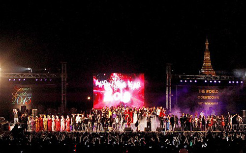 រៀបចំការបាញ់ កាំជ្រួចផ្កាជាលើកដំបូងក្នុងឱកាសទទូលឆ្នាំថ្មី ២០១៣ ដោយមានការចូលរួមរបស់មនុស្សរាប់ពាន់នាក់ចូលរួម នៅវត្តមាស Shwedagon។