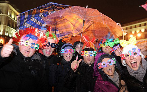 | ភ្ញៀវទេសចរណ៍អ៊ីតាលីទទួលឆ្នាំថ្មីនៅទីលាន Puerta del Sol នៅ Madrid (អេស្ប៉ាញ) |