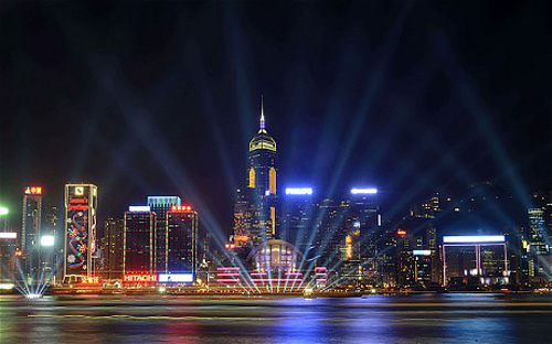 | នាទីសម្តែង laser លើស្ពានកំពង់ផែ Victoria នៅ ហុងកុង (ចិន)។ |