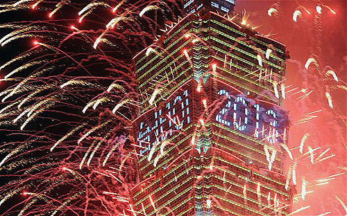 | ការបាញ់កាំជ្រួចផ្កានៅអាគារ Taipei 101 នៅ តៃវ៉ាន់ (ចិន) ។ |