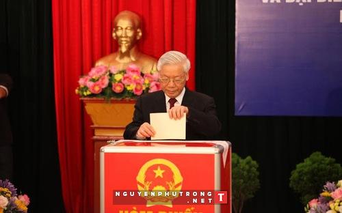 | អគ្គលេខាបក្សកម្មុយនិស្តវៀតណាម លោក Nguyen Phu Trong បានអញ្ជើញទៅបោះ ឆ្នោតនៅមណ្ឌលបោះឆ្នោតលេខទី ៣ សង្កាត់ Nguyen Du ខ័ណ្ឌ Hai Ba Trung ទីក្រុង ហាណូយ។ |