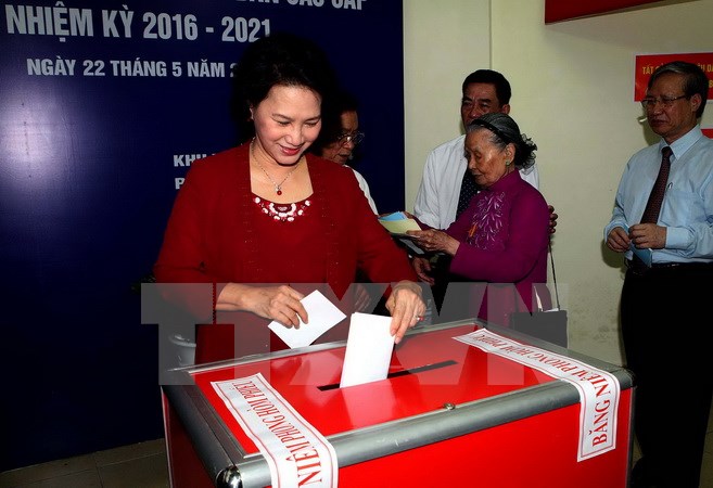 | ប្រធានរដ្ឋសភាវៀតណាមនិងជាប្រធានក្រុមប្រឹក្សាជាតិរៀបចំការបោះឆ្នោត លោកស្រី Nguyen Thi Kim Ngan បានអញ្ជើញទៅបោះឆ្នោតនៅមណ្ឌលបោះឆ្នោតលេខទី ៤ សង្កាត់ Vinh Phuc ខ័ណ្ឌ Ba Dinh ទីក្រុងហាណូយ។ |