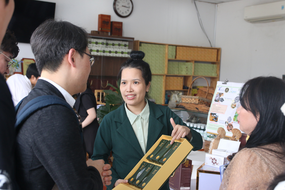 ភ្ញៀវទេសចរបរទេសមកទស្សនាតំបន់តាំងបង្ហាញផលិតផលនៃវិទ្យាស្ថានស្រាវជ្រាវនៃសាកលវិទ្យាល័យ Thu Dau Mot។ រូបថត៖ Thiên Lý