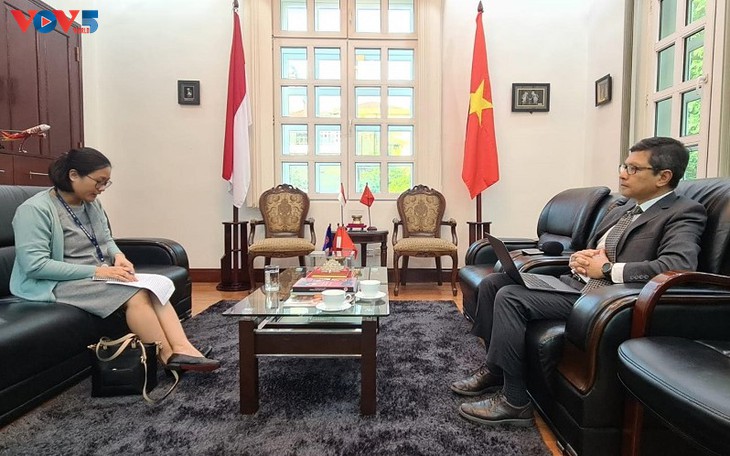 ឯកអគ្គរដ្ឋទូតឥណ្ឌូនេស៊ីប្រចាំវៀតណាមលោក Denny Abdi ឆ្លើយបទសម្ភាសន៍ជាមួយអ្នកសារព័ត៌មាន VOV។ (រូបថត៖ VOV៥) |