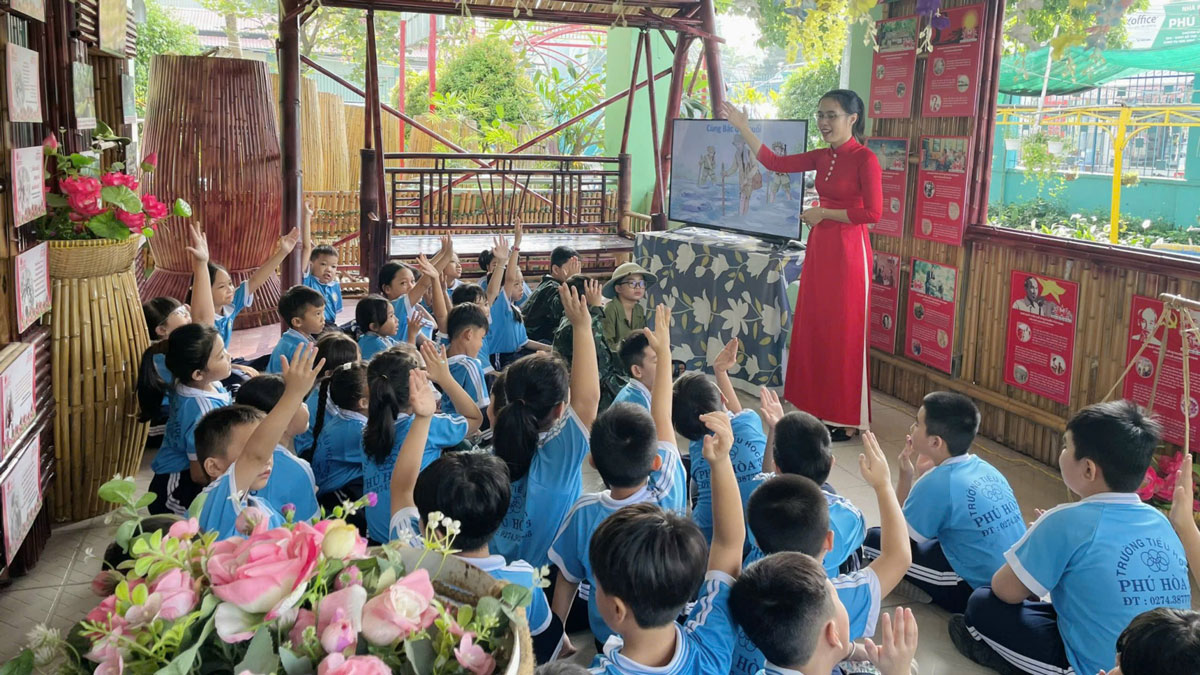 ចូលសាលាបឋមសិក្សា Phu Hoa ៣ នៅទីក្រុង Thu Dau Mot ខេត្ត Binh Duong នៅហ្នឹងសាលធំ ជ្រុងតូចមួយដែលតុបតែងលម្អដោយឫស្សី និងឈើបានទាក់ទាញមនុស្សគ្រប់គ្នា។ នោះគឺជា “បរិយាកាសវប្បធម៌ហូជីមិញ” ដែលសិស្សានុសិស្សអាចស្វែងយល់អំពីអគ្គមគ្គុទេសដ៏មហិមាររបស់ប្រជាជាតិ។ ជាមួយនឹងរបស់របរប្រើប្រាស់ដ៏ជិតស្និទ្ធដូចជា៖ ស្បែកជើងកៅស៊ូ មួកយោធាក្រណាត់ រួមជាមួយនឹងរូបភាព និងឯកសារដ៏រស់រវើកអំពីលោកប្រធានហូជីមិញនោះ ជ្រុងតូចមួយនេះប្រៀបប្រដូចជាសារមន្ទីរខ្នាតតូចមួយអញ្ចឹង ដែលជួយសិស្សឱ្យស្រមើស្រមៃបានយ៉ាងច្បាស់ថែមទៀតអំពីឆាកជីវិត និងអាជីពរបស់លោកប្រធានហូជីមិញ។ អ្នកគ្រូ Le Thi Kim Thuy នាយិកាសាលាបានឲ្យដឹងថា៖