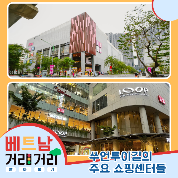 홍응옥: 네, 쑤언투이 거리에서 4년 동안 다닌 경험을 가진 제가 청취자 여러분께 이 거리에 오시면 꼭 방문해 보셔야 할 다른 흥미로운 장소들을 추천해 드리겠습니다. 먼저, 이 거리에 있는 두 개의 대형 쇼핑몰을 빼놓을 수 없습니다. 바로 이온 쑤언투이(122~124번지)와 더 루프 쇼핑센터(The Loop, 241번지)입니다. 이곳들은 맛있는 음식, 쇼핑, 그리고 영화 관람 같은 엔터테인먼트 활동을 한 번에 즐길 수 있는 복합 공간입니다.
