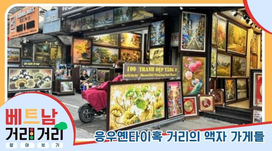 뚱응옥: 앞에서 말씀드린 것처럼, 오늘 소개할 응우옌타이혹 거리는 ‘액자 제작’으로도 꽤 유명합니다. 이곳의 액자 가게들은 1980~1990년대에 본격적으로 늘어나며 크게 자리 잡았는데요. 그 배경에는 위치적인 장점이 있습니다. 바로 가까이에 베트남 국립미술관과 문묘-국자감이 있어서, 그림이나 인테리어에 관심 있는 사람들이 자연스럽게 이 거리로 모이게 된 거죠. 지금은 거리 곳곳에 액자 전문점이 여러 곳 들어서 있고, 액자 제작뿐 아니라 그림 판매, 광고 디자인, 인쇄 같은 서비스도 함께 제공하는 곳이 많습니다.