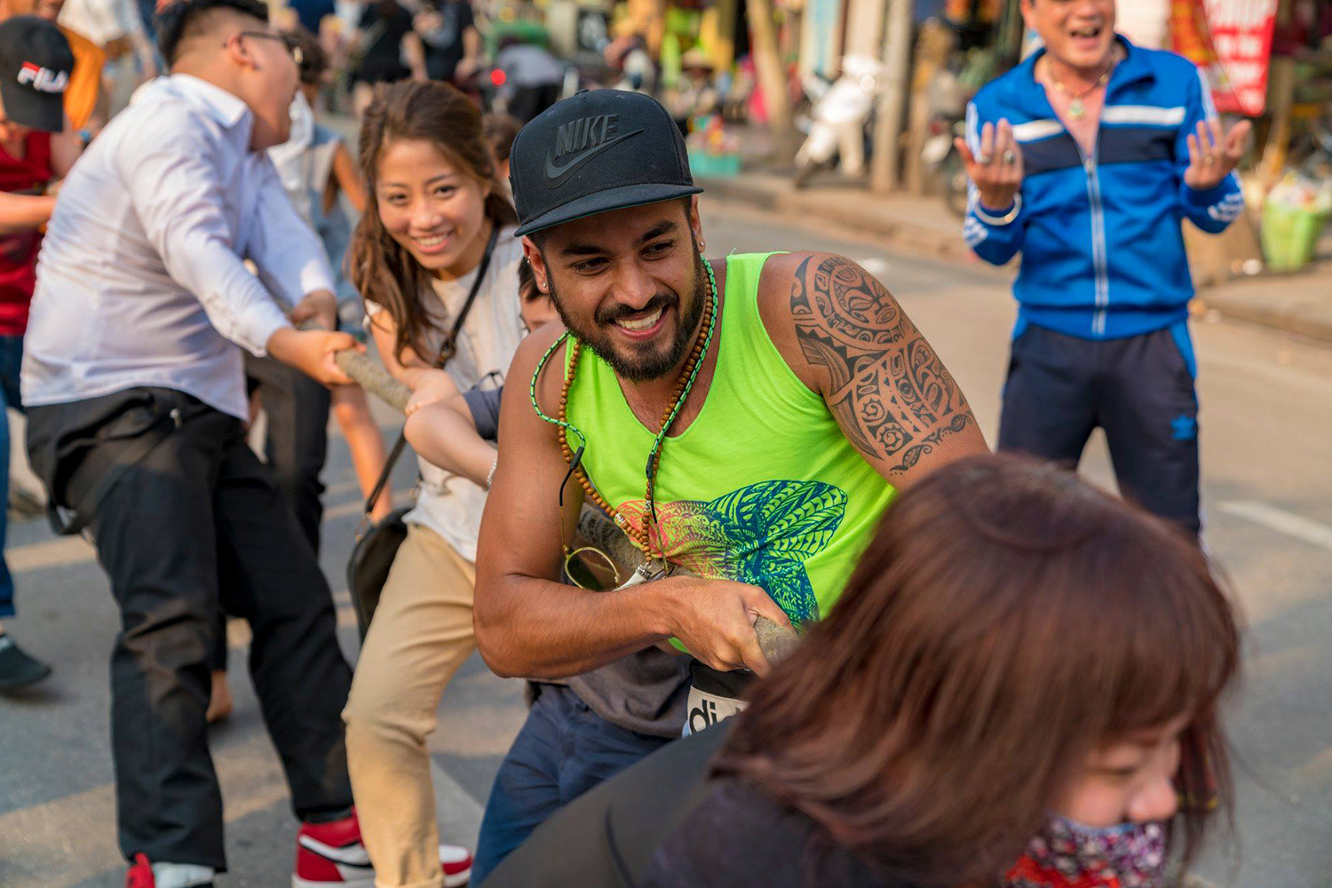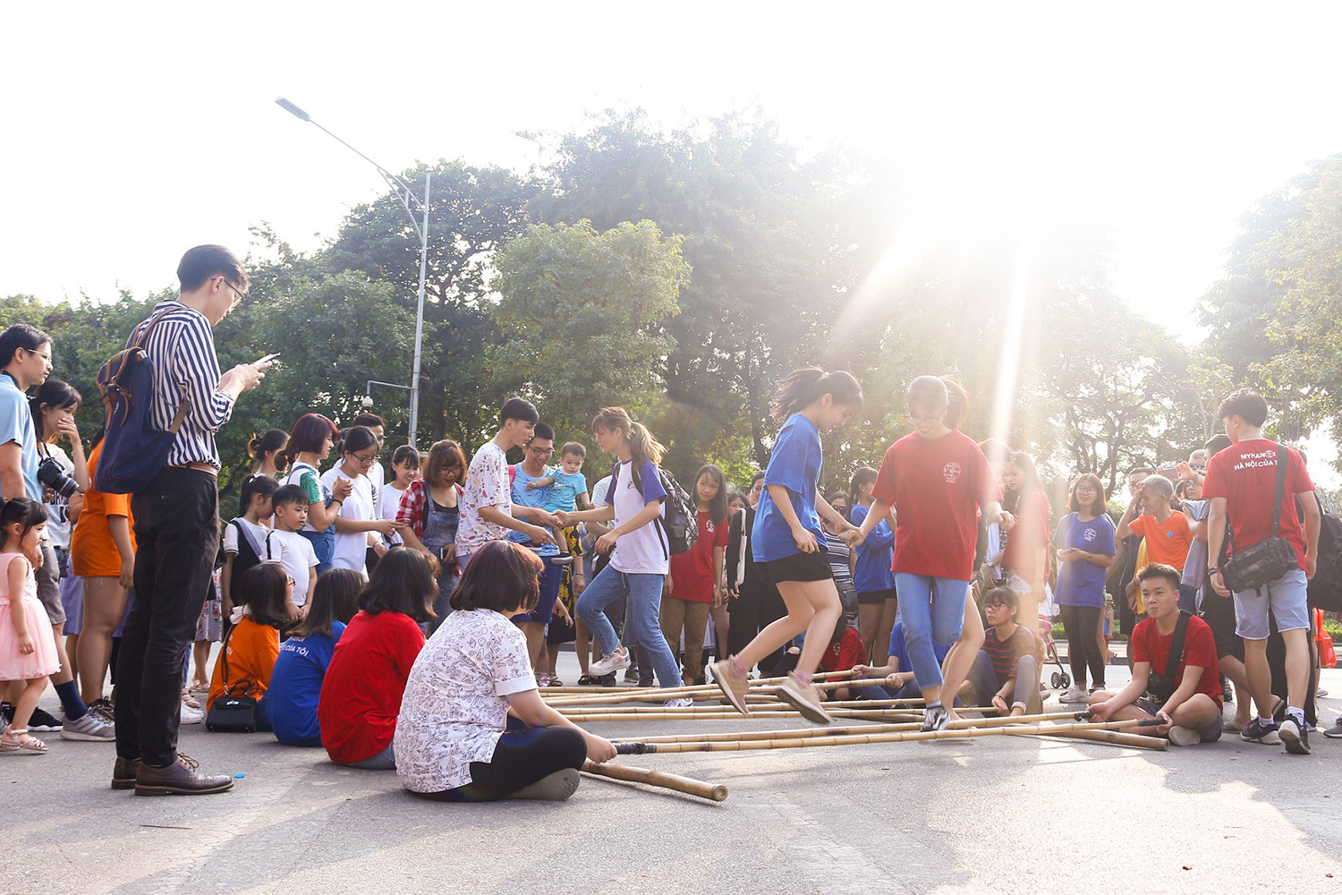 MyHanoi 동아리 봉사자의 적극적인 안내로 관광객들이 활발하고 역동적인 분위기 속에서 줄다리기나 줄넘기에 참가할 수 있다. 남녀노소 누구나 팀워크 정신으로 함께 어울리는 이 민속놀이는 사람들을 더 가까이 해주고, 도보 전용거리로부터 친밀한 분위기를 만들어낸다.