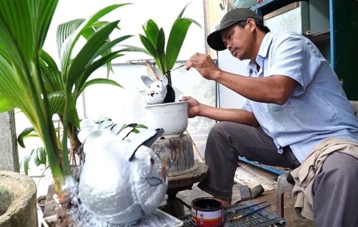꽝응아이성 짜인로(Chánh Lộ)동에 위치한 한 나무정원 주인인 쩐 반 라인(Trần Văn Lành)씨는 고양이 모양의 코코넛 분재 상품을 시장에 공급한다. (사진: baovanhoa.vn)