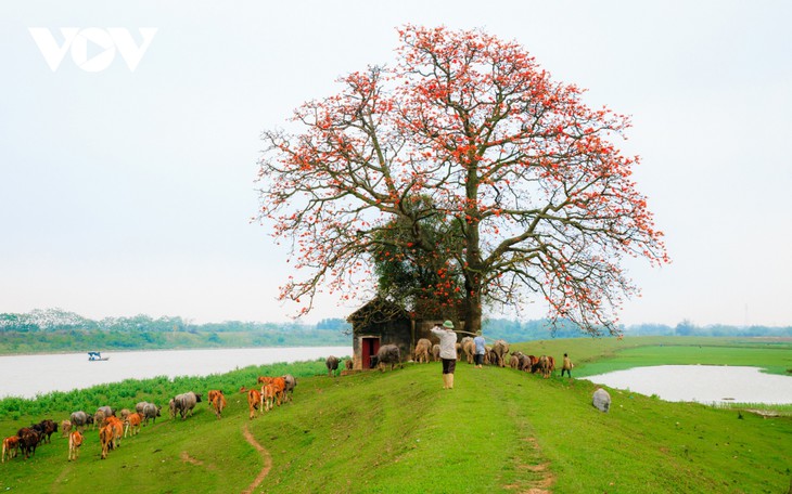 | 목면은 베트남 농촌과 농민의 생활과 밀접한 관계에 있는 익숙한 나무이지만 위엄있게 우뚝 선 모습을 보이고 있다. [사진: 타인선] |