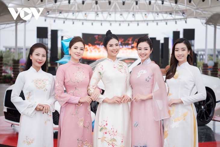![]() 꽝닌성 행사에서 아오자이를 입고 참석한 미스 베트남과 유명 MC들 (사진: VOV) |