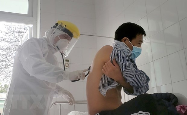 푹옌 (Phúc Yên) 종합병원 감염과 쩐 꽝 빈(Trần Quang Vịnh) 과장이 2월 24일에 1차 음성반응을 보인 N.T.D 환자의 친아버지인 응우옌 반 V (Nguyễn Văn V)환자를 진찰하고 있다. |