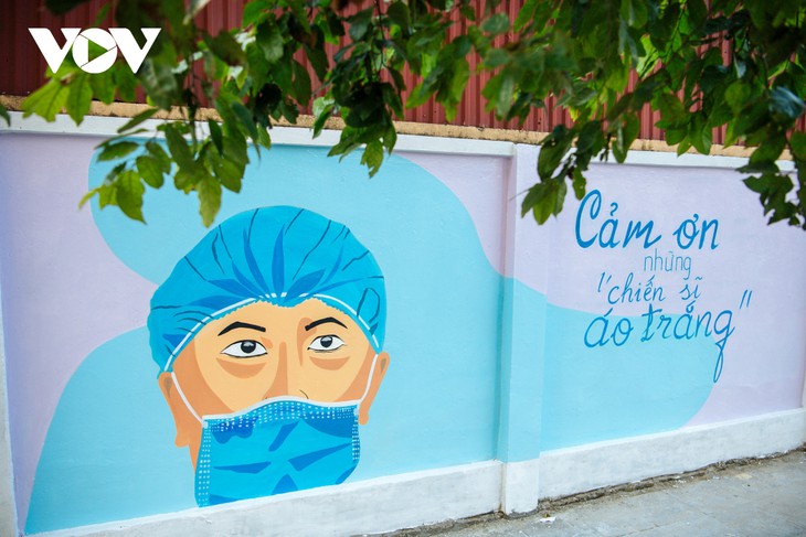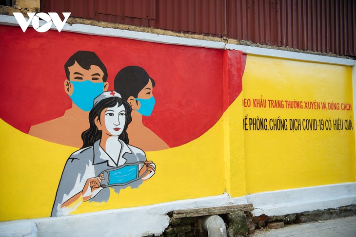 | 코로나19 방역 정보 제공과 선전을 위해 하동 (Hà Đông) 군 당국은 화가들과 협력하여 부 쫑 카인 (Vũ Trọng Khánh) 거리에 벽화를 그리기로 했다. |
