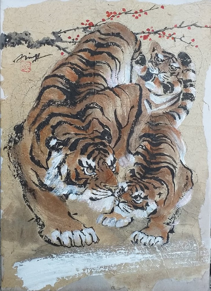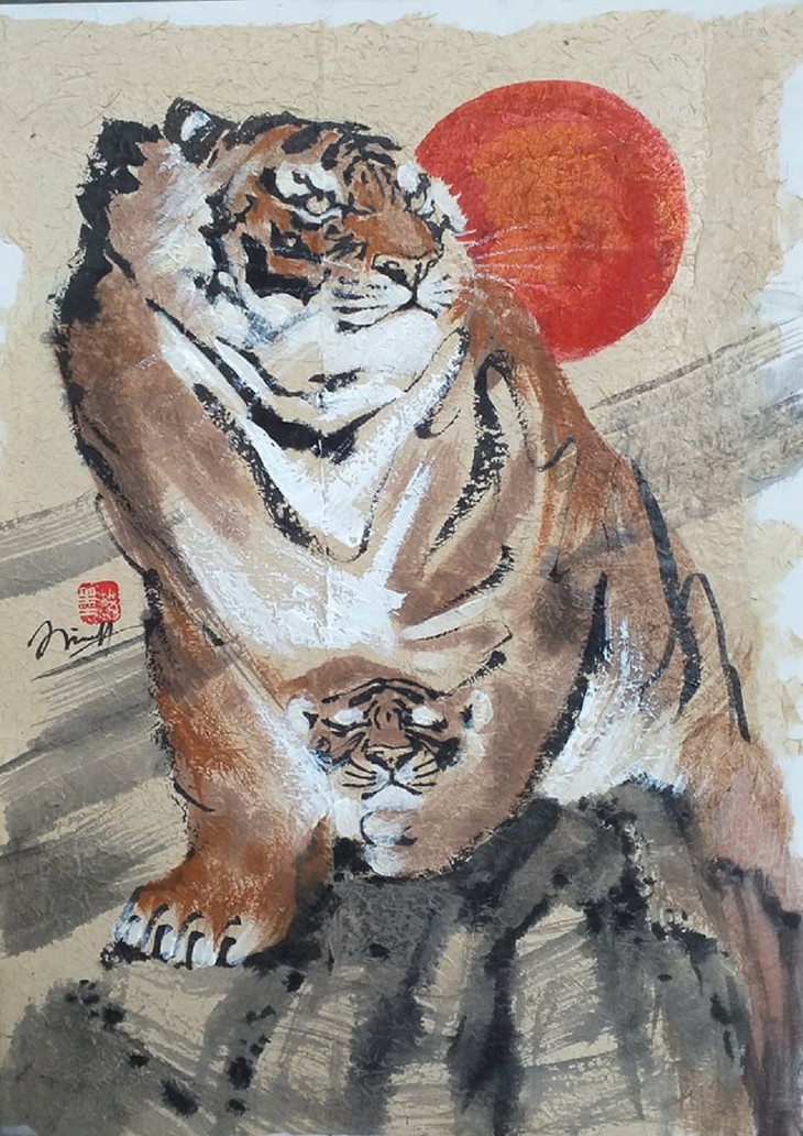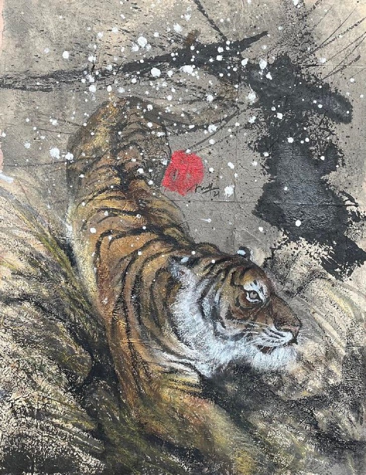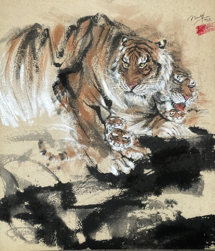 ![]() 그의 호랑이 그림을 통해, 화가 응우옌 단닌은 숲의 신의 늠름한 이미지를 조각하는 것 외에도 모성애와 같은 인간에 가까운 감정적 뉘앙스에 대해 이야기하고 싶어한다.