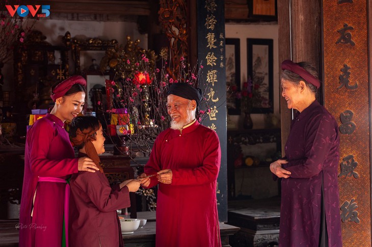 ![]() 조부모님, 부모님들은 새해 복장을 위해 집안의 아이들에게 빨간 세뱃갑을 보낸다. 베트남 전통 설날에 없어서는 안 될 풍습으로 보인다. |