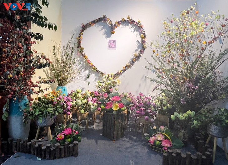 | 이맘때 하노이에서 연꽃이 많이 피지 않아 전시 공간을 더욱 생동감 있게 만들기 위해 낌득 화가는 남부 지방에서 연꽃을 주문해서 사용했다. |