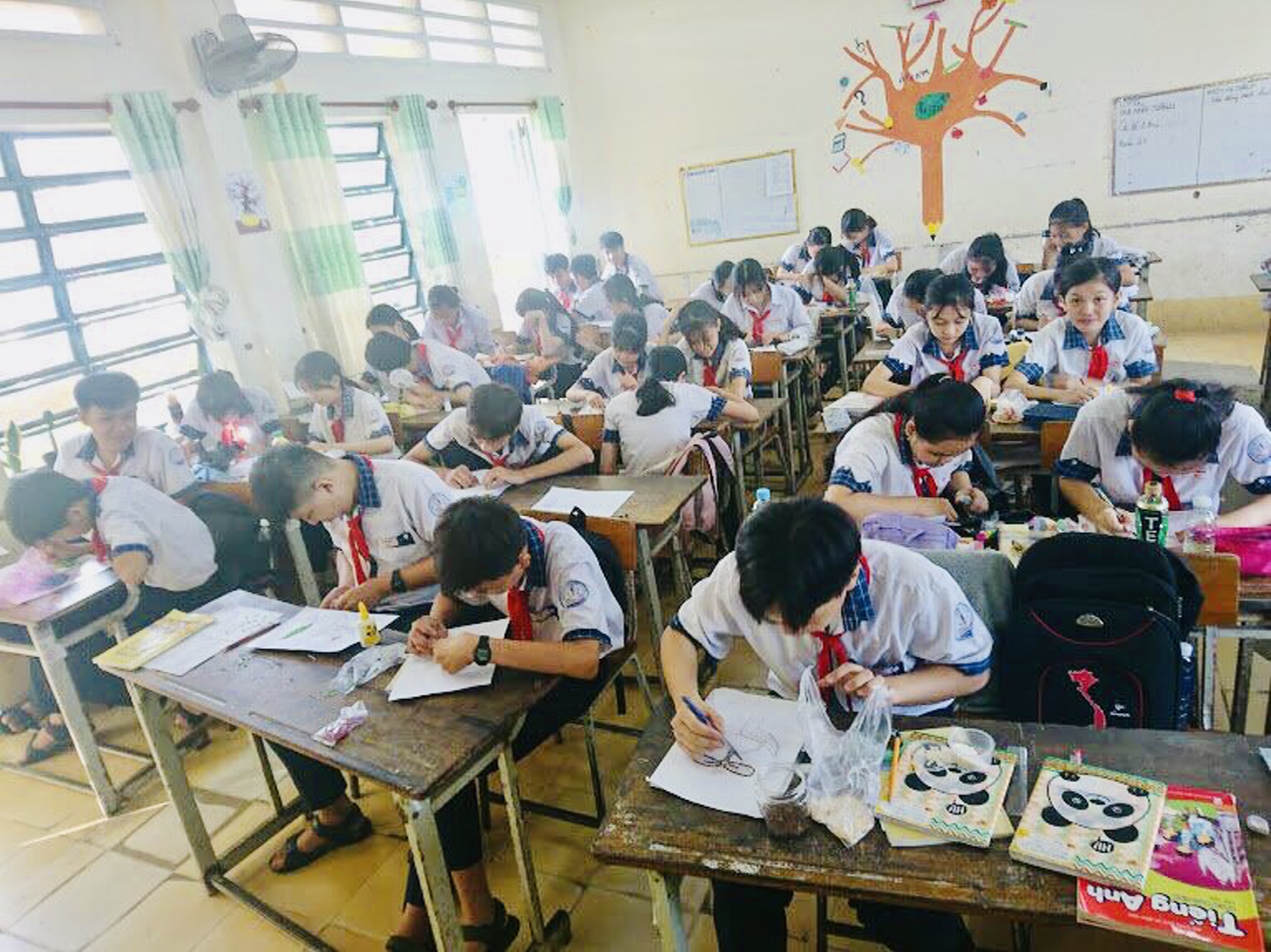창의적 수업들을 통해 트엉타인중학교 학생들이 쌀이나 재활용품으로 만들어진 그림에 그리는 것에 몰두한다. [사진: VOV]
