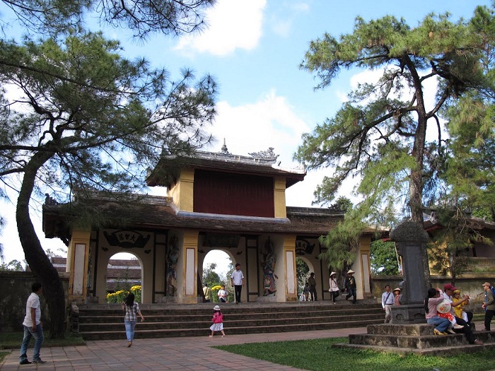 가운데는 사원의 정전인 대웅전 (大雄殿)이다. 대웅전 안에 미륵불상이 있다. 미륵불은 중생의 힘든 이야기를 경청하는 큰 귀가 있고, 민중의 잘못을 포용하는 큰 배가 있으며, 천하의 웃기 어려운 이야기를 웃는 입이 있다. 정전 위에는 ‘영취고봉’ (靈鷲高峰)이라는 4글자가 새겨진 편액과 일월 무늬가 있는 범종도 설치되어 있다. 종 소리가 울릴 때마다 후에의 영혼도 흐엉강의 흐름에 따라 넓은 공간으로 퍼져 나가는 듯하고, 관광객들 마음 속에 평화스러움과 고요함을 남긴다. 하이즈엉 (Hải Dương) 성에서 온 판응옥뚜엔 (Phan Ngọc Tuyến)은 다음과 같이 나누었다.