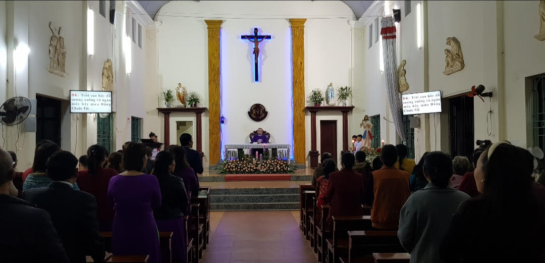 호아빈성 쭝민 성당에서 예배하는 신자들 [사진: 응옥 아인] |