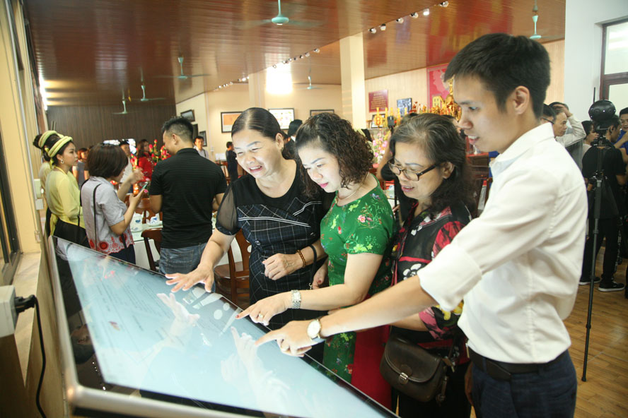 하노이시 짜람현에 위치한 밧짱 직업마을 관광정보센터에서 스마트관광 애플리케이션을 체험하는 방문객 [사진: hanoimoi.com]