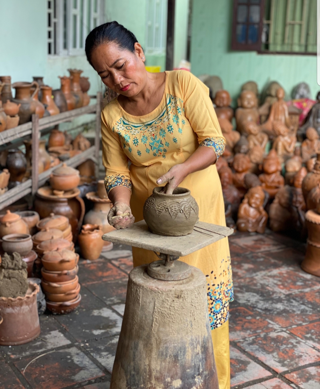 “흙은 물에 담그고 발로 밟고 반죽한 다음에 부드럽게 되도록 깎아주고 긁어내면서 무늬를 만듭니다. 또한 마를 때까지 굽습니다. 흙과 모래를 넣어 더욱 부드럽게 만듭니다. 저희 집은 4대째 도자기를 만들어 왔는데, 갈수록 더 예쁜 작품들을 만들어 내고 있습니다.”
