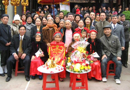 이른 아침부터 하노이 타인와이(Thanh Oai)현 까오즈엉(Cao Dương)면 티응우옌(Thị Nguyên) 마을의 스피커를 통해 활기찬 음악이 울리고 마을 회관에서 축하 행사 소식이 전파됐다. 올해 장수 어르신이 계신 가정에서는 축하를 위해 바쁘게 준비하고 있었다. 자녀들은 일찍부터 고향으로 돌아오고, 각자 집을 청소하거나 테이블과 의자를 준비하거나 축수 잔치를 준비한다. 모두가 가장 예쁜 옷을 골라서 입는다. 7시 30분 의례 연주대와 용춤 무용단이 축수를 받는 노인들을 마을 서낭당으로 모시고 행진하기 시작했다. 8시 30분 모든 사람들이 마을 회관에 모였다. 행사의 따뜻하면서 장엄한 분위기는 어르신들을 매우 기쁘게 만들었다.