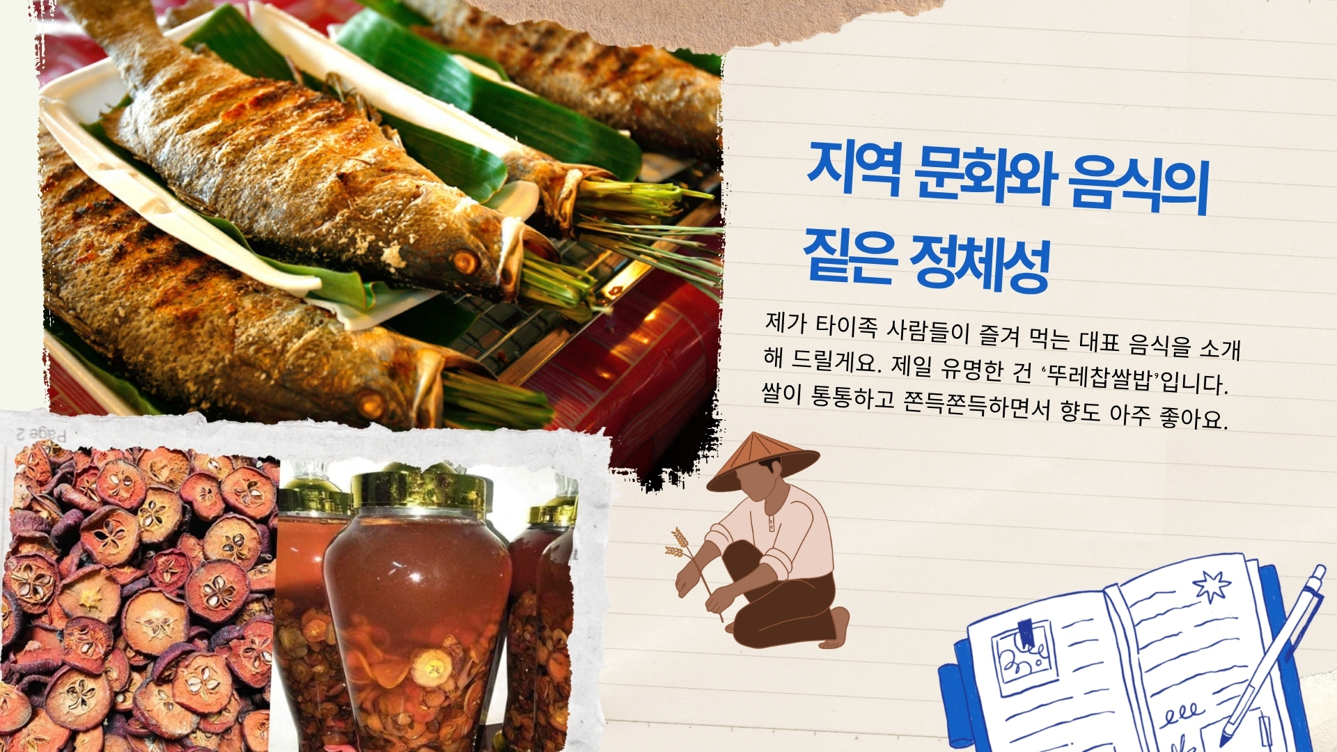 지엡: 맞아요! 제가 타이족 사람들이 즐겨 먹는 대표 음식을 소개해 드릴게요. 제일 유명한 건 ‘뚜레 찹쌀밥’입니다. 쌀이 통통하고 쫀득쫀득하면서 향도 아주 좋아요. 그리고 검은 닭과 산돼지 구이도 있습니다. 작은 식당에서 ‘따오메오’라는 야생 사과 술이랑 같이 먹으면 정말 맛있어요. 진짜 멈출 수 없을 만큼 맛있답니다!