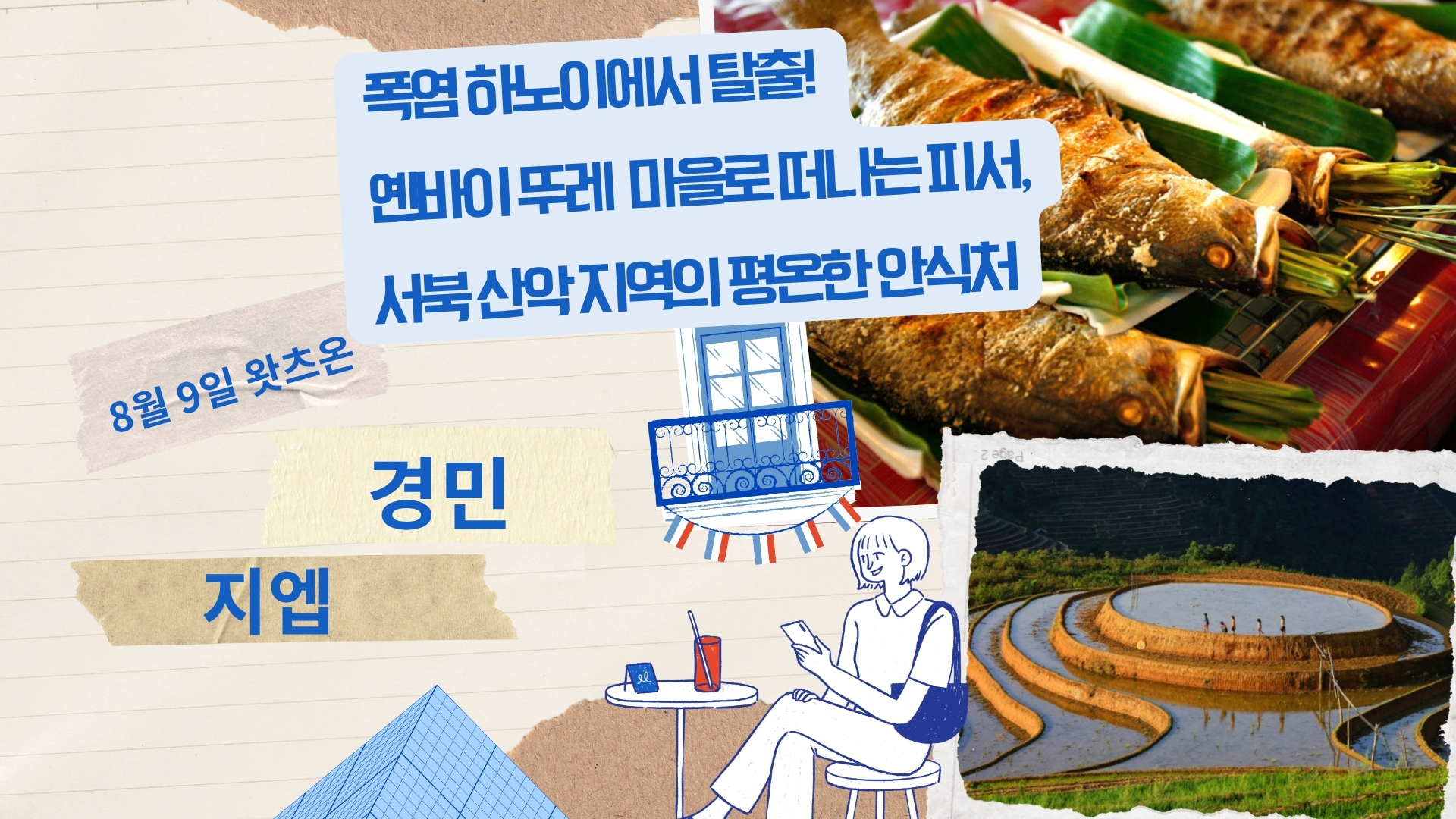 지엡: 네, 청취자 여러분. 이번 여행은 단순한 관광을 넘어, 작은 모험이 될 것입니다. 하노이에서 출발해 서북부 산악 지역으로 향하는 여정은 다소 시간이 걸릴 수 있지만, 이동 중에 펼쳐지는 경치만으로도 경민 씨와 여러분 모두의 기대를 충족시켜 드릴 거예요. 첫 번째 목적지는 바로 계단식 논입니다. 9월에서 10월 사이 벼가 익어 황금빛으로 물드는 계절에 방문하면, 계곡 전체가 눈부신 황금 바다로 변합니다. 논길 사이를 거닐며 맑고 신선한 공기를 마시면, 도시의 매연 냄새와는 전혀 다른 자연의 숨결을 느낄 수 있죠. 특히 뚜레는 베트남에서도 가장 맛있는 찹쌀을 재배하는 지역 중 하나로, 저희는 이 지역의 특별한 찹쌀 요리도 맛볼 수 있습니다.