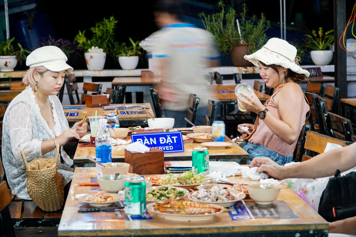 [A]: 야시장은 오후 5시부터 시작됩니다. 이 시점에 거리음식점들이 문을 열어 6시쯤되면 더 붐비고 밤 11시까지 판매 활동이 이루어집니다. 이는 푸 꾸억 야시장의 생활 리듬이죠.