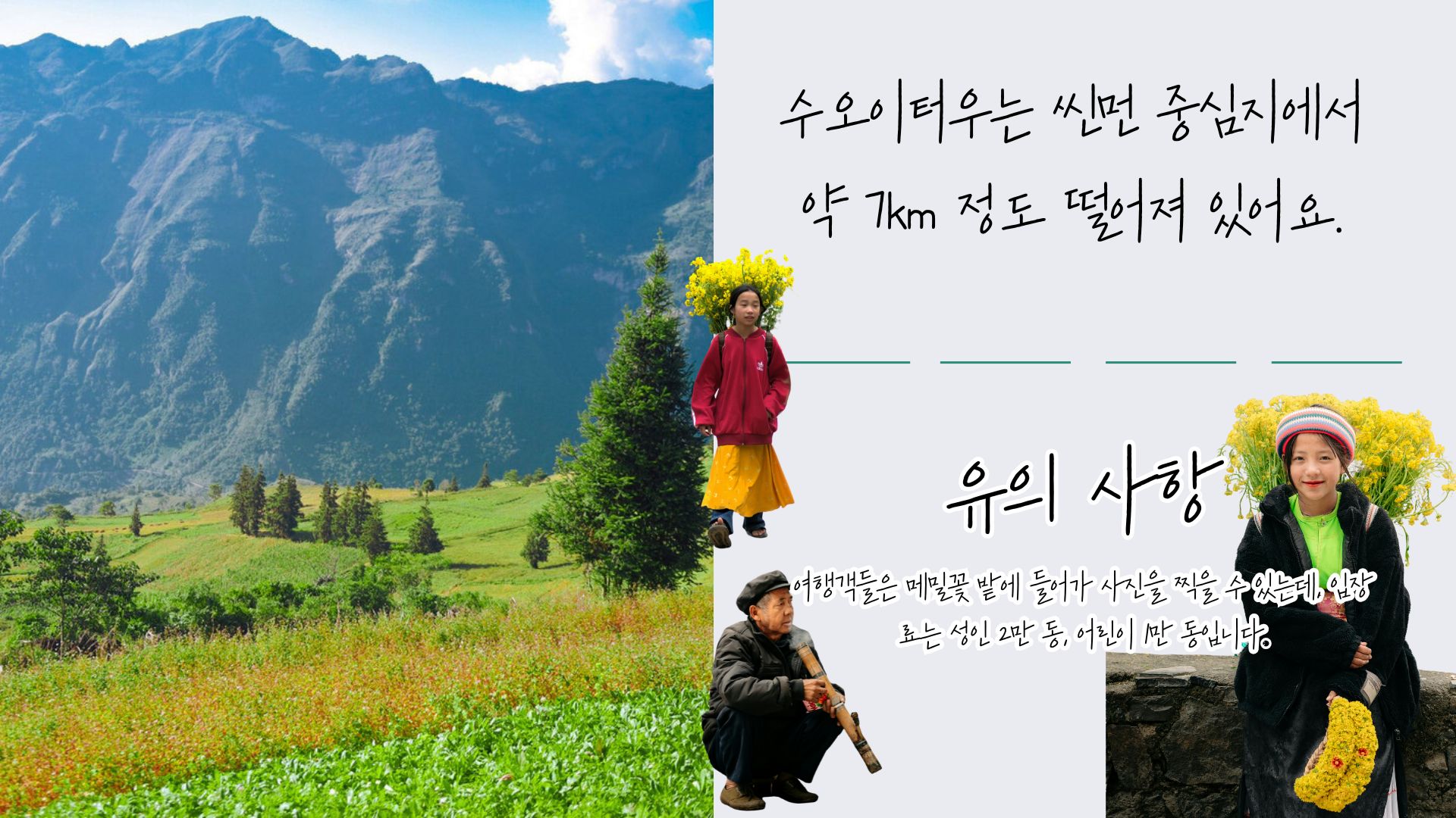 응옥: 이곳에 사는 몽족 주민들은 주로 쌀, 옥수수, 약초 같은 곡물을 재배하고 있어요. 수확이 끝나면 땅과 기후에 맞는 꽃들을 심는데, 대표적으로 메밀꽃과 유채꽃이 있답니다. 이렇게 주민들은 생활 식량을 마련함과 동시에 관광 자원으로도 활용하고 있지요. 여행객들은 메밀꽃 밭에 들어가 사진을 찍을 수 있는데, 입장료는 성인 2만 동, 어린이 1만 동입니다.