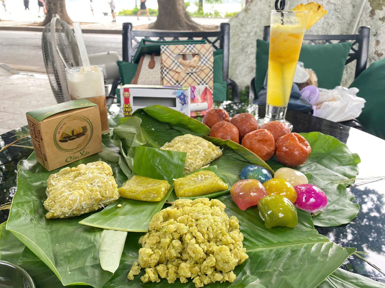 B: Cốm is perhaps the most iconic of all Hanoi's autumn treats. Made from young, green rice harvested just before it fully matures, cốm is lightly roasted and flattened into soft, chewy flakes. It's often wrapped in lotus leaves, which impart a subtle fragrance.